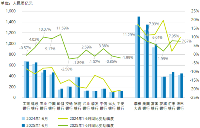 2025年上半年,境内银行的手续费及佣金净收入合计3,708亿元,同比增加117亿元,增幅3.25%,呈上升趋势。除理财市场规模增长外,跨境金融多元化及场景服务生态化等多方面因素导致中收业务由降转增。境外银行手续费及佣金净收入合计5,155亿元,同比增长382亿元,增幅8.01%。除花旗银行增速较为平缓外,其他境外银行的手续费及佣金净收入均呈现出较高比例的增长。