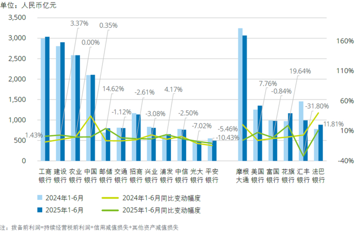 2025年上半年,境内银行拨备前利润呈上升趋势,拨备前利润合计1.65万亿元,同比增加95亿元,增幅为0.58%。境外银行拨备前利润合计8,434亿元,同比减少275亿元,降幅为3.07%,与同期相比由增转降。