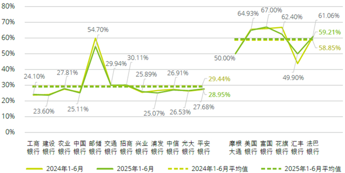 2025年上半年,境内银行平均成本收入比为28.95%,同比下降0.49个百分点。境外银行成本收入比整体高于境内银行,平均为59.21%,同比增加0.36个百分点。