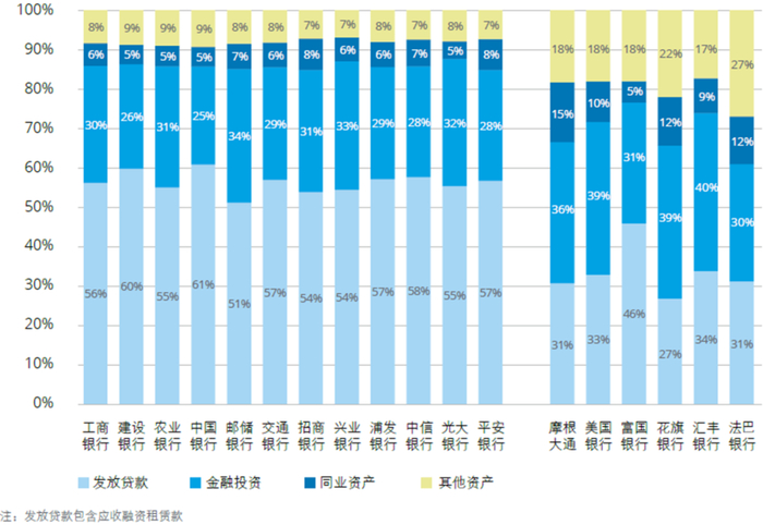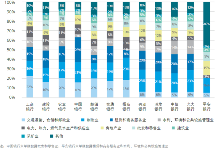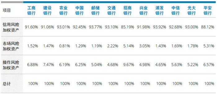 具体来看,除招商银行和平安银行外,其余境内银行风险加权资产的构成中,信用风险加权资产的占比都超过了90%,平均占比为91.66%,较上年末平均占比91.63%上升0.03个百分点。