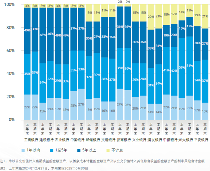 2025年6月末,境内银行债券投资余额71.54万亿元,较上年末增加4.80万亿元,增速7.19%,境内银行的金融投资所属利率重定价区间在1年以内、1至5年及5年以上的金额平均占比分别为20%、35%和38%,期限结构较上年末总体保持稳定,长期限金融投资占比相对较高。