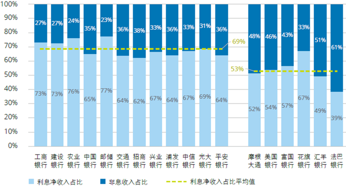 从营业收入的结构来看,境内银行的平均利息净收入占营业收入的比例(“利息净收入占比”)为69%,较上年同期下降1个百分点。境外银行的平均利息净收入占比为53%,利息净收入占比明显低于境内银行,非息业务更具优势。