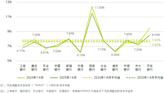 2025年上半年,因为净利润增速普遍缓于风险加权资产和资本净额增速,境内银行的平均风险加权资产收益率(“RORWA”)及平均风险调整资本回报率(“RAROC”)基本呈下降趋势。其中境内银行RORWA均值为1.20%,同比下降0.11个百分点。境内银行RAROC均值为7.61%,同比下降0.22个百分点。