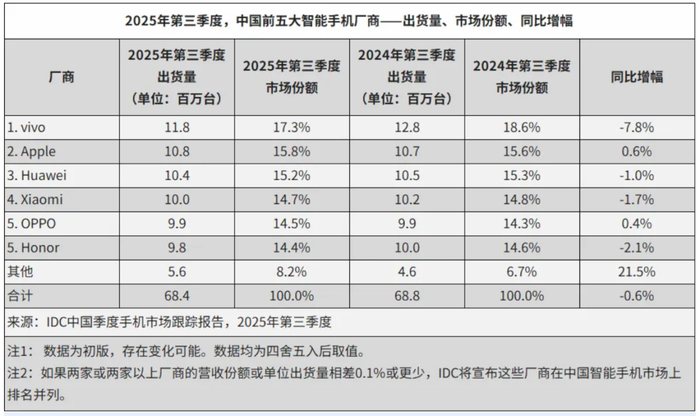 IDC发布的2025Q3「中国」智能手机市场出货量份额TOP6则依次是❶vivo含iQOO(17.3%份额)❷苹果(15.8%)❸华为(15.2%)❹小米含红米(14.7%)❺OPPO含一加(14.5%)❻荣耀(14.4%)。