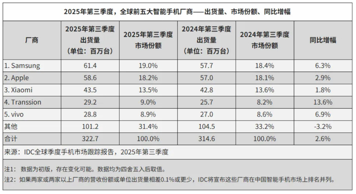 首先是IDC的数据,2025Q3「全球」智能手机市场TOP5依次是:❶三星(19%份额)❷苹果(18.2%)❸小米含红米(13.5%) ❹传音家族(9%) ❺vivo含iQOO(8.9%);