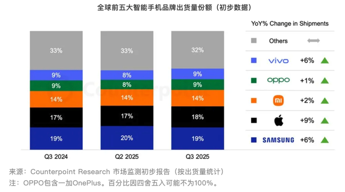 另一家机构Counterpoint更新的2025Q3全球智能手机出货量初步份额TOP5则依次是:❶三星,19%份额,同比增长6%;❷苹果,18%份额,同比增长9%;❸小米+红米,14%份额,同比增长2%;❹OPPO+一加,9%份额,同比增长1%;❺vivo+iQOO,9%份额,同比增长6%;其它品牌合计约32%份额。