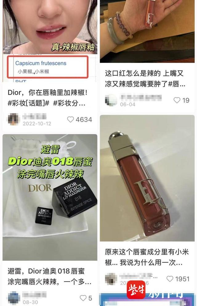 早在2022年,就有博主发布视频称,她在第一次使用迪奥某款唇釉时,感觉整个嘴好痛,还以为是自身体质问题。“刚涂上时还算比较正常,过了一段时间后,嘴巴就肿了!它的颜色和质感都挺好的,就是上嘴之后真的好痛!”该博主在视频中表示,她在查询后才发现,该款唇釉中添加了“小果椒,小米辣”的成分。网友们纷纷表示:“没想到丰唇效果居然是用辣椒辣的!”
