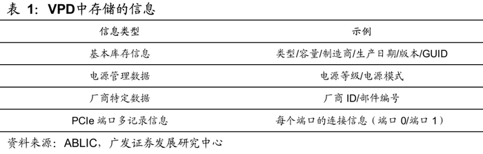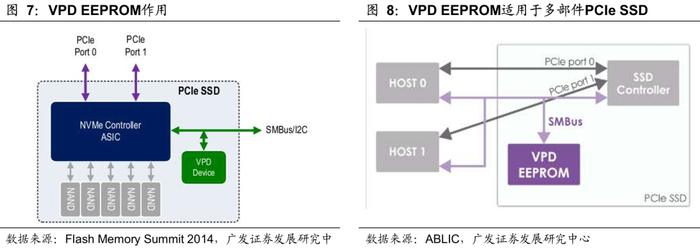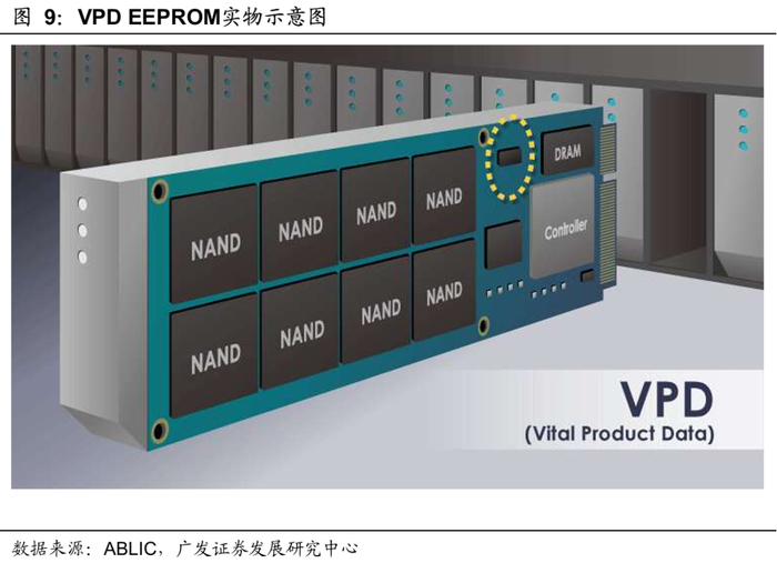SSD升级有望带来VPD成长机会。SSD VPD(Vital Product Data)包括基本信息,电源管理数据、厂商特定数据、PCIe端口记录信息等,一般存放于EEPROM中,EEPROM的可靠性和准确性直接关系到固态存储设备能否正常工作和性能发挥。VPD通过SMBus连接到SSD控制器和主机,用户可以通过SMBus读取或写入信息和数据。VPD EEPROM适用于多部件PCIe SSD,由于各部件间互联信息正变得越来越复杂,对于VPD EEPROM的需求日益增长。SSD性能提升将推动VPD EEPROM产品技术规格升级,如将存储容量从4Kbit向上升级,从I2C总线升级至I3C总线,增加内置温度传感器功能等,VPD EEPROM价值量也有望随性能升级进一步提升。