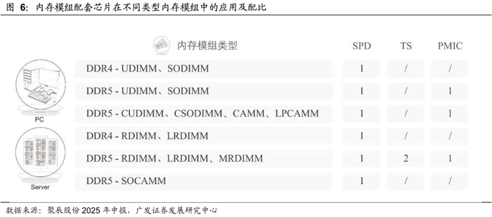 DDR5升级带来SPD成长机会。DDR5内存模组较DDR4内存模组具有速度更快、功耗更低、带宽更高等优势,正广泛应用于AI服务器中。SPD(串行存在检测器)作为内存条上的关键组件,通过标准化配置信息的存储与传递,成为系统自动优化内存参数的核心枢纽。DDR5世代下SPD将有所升级,主要体现在:(1)容量从DDR4的512字节升级至DDR5的1024字节,用于存储内存模组的相关信息以及内存颗粒和相关器件的配置参数;(2)集成I2C/I3C总线集线器(Hub),加速初始化进程;(3)增加PMIC(电源管理芯片)和高精度温度传感器(TS)配置。总体来看,SPD芯片技术规格和单价较DDR4世代更高,随DDR5渗透不断扩大,在价值量与需求量的双重维度驱动,DDR5 SPD市场快速发展。