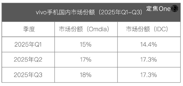 这次轮到vivo。根据Omdia和IDC的数据,vivo以18%左右的市场份额重返榜首。华为与苹果则在15-16%的区间内争夺第二、三名。