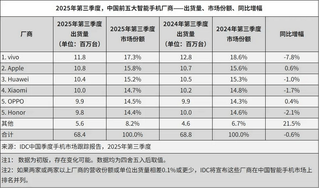 2025年Q3中国手机市场vivo重返榜首,华为苹果紧随其后