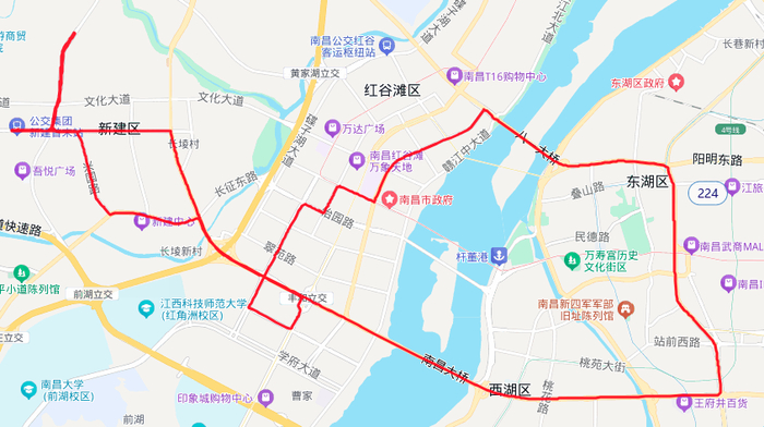 1.原线路走向:明矾路—兴国路—新建大道—礼步湖大道—南斯友好路—南昌大桥—洪城路—解放西路—上海路—北京东路—高新南大道(往返);