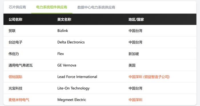 电力系统组件伙伴上,则包括台达电子、伟创力、光宝科技和麦格米特等,负责优化高密度PDU和转换器。