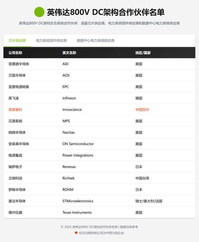 在芯片层面,英伟达与十四家供应商合作,包括英飞凌、英诺赛科、纳微半导体、意法半导体等,这些公司负责提供SiC/GaN高效器件,支持高压、高效率的电源转换。