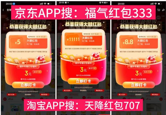 领取时间:10月9日-11月11日。先在APP搜一下口令,以后每天点历史记录就可以直接领取了。