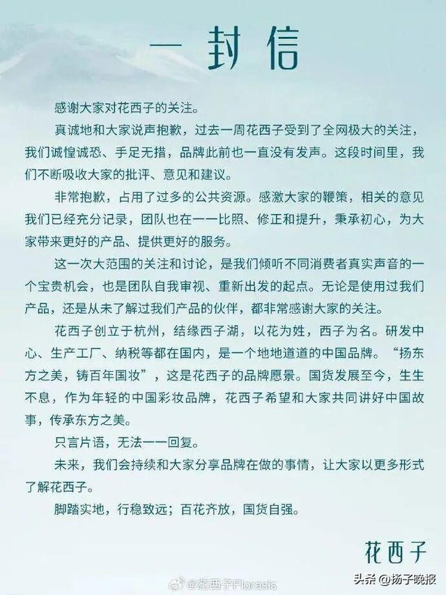 文章中称,外界普遍认为《一封信》是极其失败的公关案例,有消息称《一封信》并非出自花西子公关部之手,公关部已有员工主动辞职。一位不愿透露姓名的花西子离职公关A,表示离职一事属实。“早在信发出前,大家就已提交离职申请。现在只剩一些入行不久的年轻公关……”“《一封信》就像是‘小学生作文’,和公关部没有关系”……
