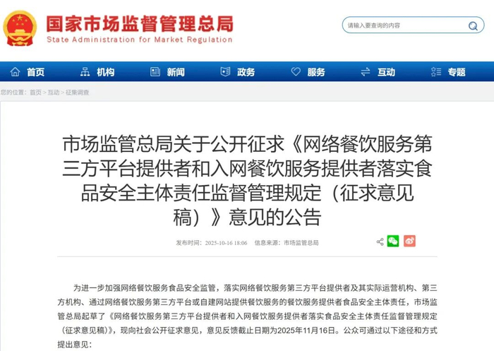 10月16日,国家市场监督管理总局(以下简称“市场监管总局”)发布《网络餐饮服务第三方平台提供者和入网餐饮服务提供者落实食品安全主体责任监督管理规定(征求意见稿)》(以下简称“征求意见稿”),面向社会公开征求意见,反馈截止日期为11月16日。