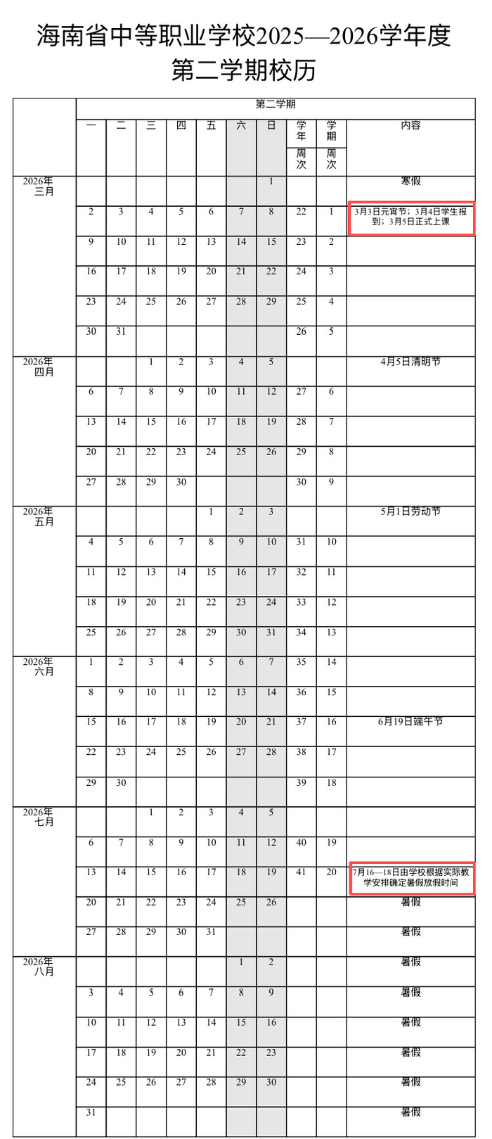 春季学期开学:2026年3月5日