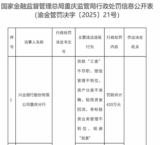 2025年单笔最大!兴业银行重庆分行领420万元罚单
