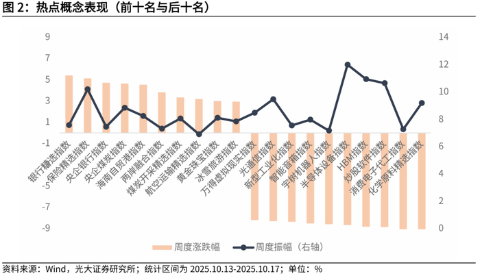 从热点概念来看,本周概念指数中表现最好的前5大概念依次为银行精选指数、保险精选指数、央企银行指数、央企煤炭指数、海南自贸港指数;表现最差的5大概念依次为化学原料精选指数、消费电子代工指数、炒股软件指数、HBM指数、半导体设备指数。