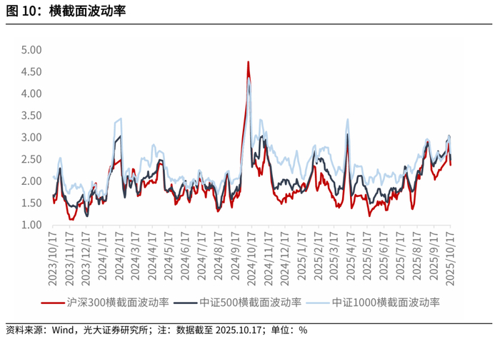 截面波动率来看,最近一周沪深300、中证500、中证1000指数成分股横截面波动率环比前一周下降,短期Alpha环境恶化。