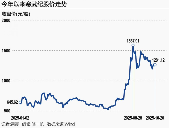 21世纪经济报道记者注意到,上述公告发布后,寒武纪股价开始震荡走低。截至10月20日收盘,寒武纪股价报1281.12元/股,总市值5360亿元。