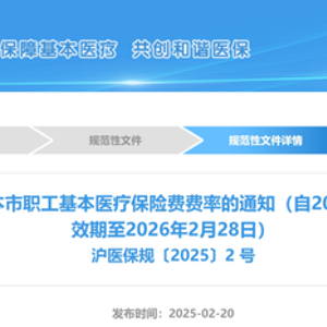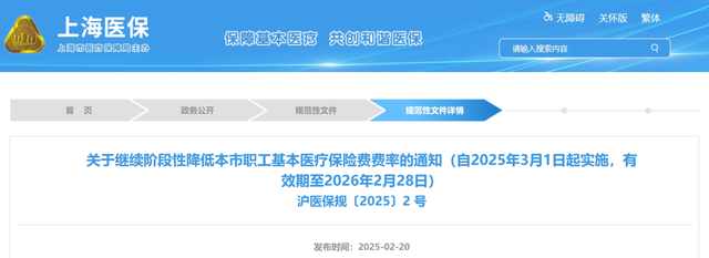 上海市医保局等部门发布《关于继续阶段性降低本市职工基本医疗保险费费率的通知》。该通知自2025年3月1日起实施,有效期至2026年2月28日。