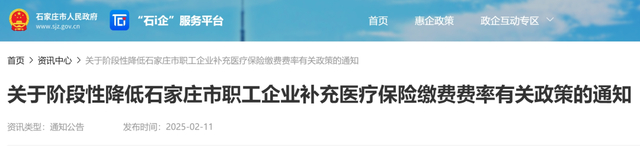 石家庄发布《关于阶段性降低石家庄市职工企业补充医疗保险缴费费率有关政策的通知》。执行时间自2025年1月1日至2025年12月31日。