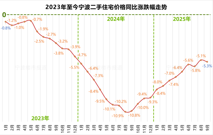 同比看,宁波二手房价同比跌幅,和新房一样,九月同样略有扩大,跌幅5.3%。