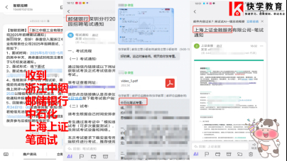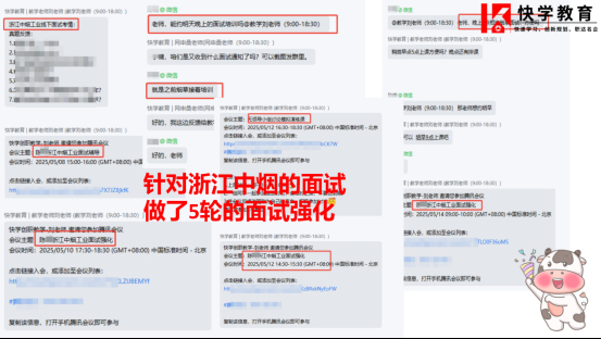 面试环节的多轮针对性辅导更让他印象深刻。收到招商银行AI面试通知时,教学刘老师第一时间发送考情,提醒“用电脑录制、控制语速和表情”;面对深南电路无领导小组面试,快学专门安排1对1腾讯会议,模拟讨论场景并指导“如何平衡观点输出与团队协作”;而针对浙江中烟面试,刘老师更是先后安排了5轮强化辅导——从初面“人岗匹配度、稳定性考察”的问答技巧,到无领导小组讨论的角色定位,再到终面的专业知识应答,每一轮都有真题反馈和优化建议,“正式面试时遇到的‘对烟草行业数字化转型的看法’,老师提前帮我梳理过思路,回答时特别从容”。