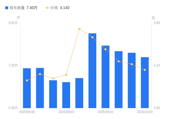 10月21日消息,数据显示,截至2025年9月30日,创新新材A股股东总户数为7.6万户,较上期(2025年9月20日)减少736户,降幅0.96%。公司最新A股总股本为37.56亿股,其中流通A股14.69亿股,户均持有流通A股数量为1.93万股,较上期增加185.35股,增幅0.97%;户均持流通A股市值8.16万元,较上期增加16.45元,增幅0.02%。
