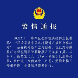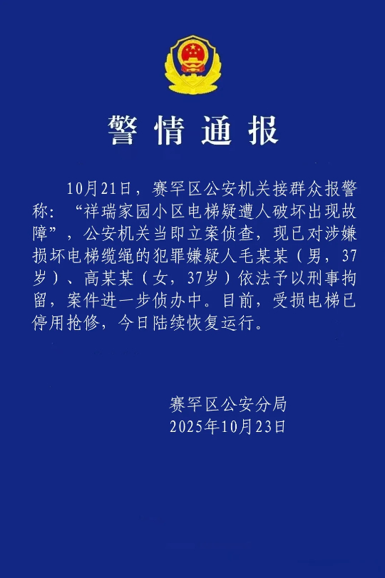 一小区23部电梯钢绳遭恶意切割!警方通报:毛某某、高某某被刑拘