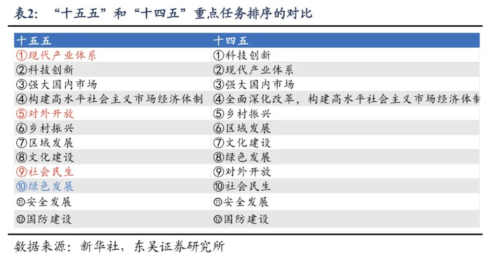 1、与“十四五”相比,12个重点任务的领域一致,但顺序有细微差异,现代产业体系、对外开放、社会民生三个主题更靠前,绿色发展比“十四五”略靠后。