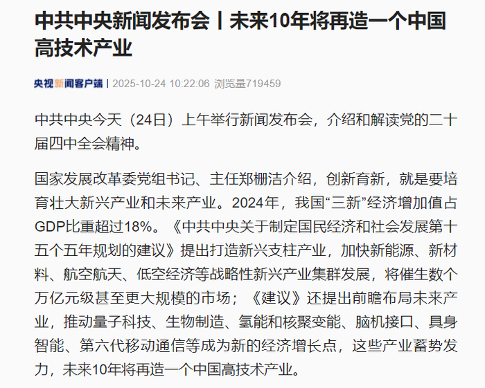 国家发展改革委党组书记、主任郑栅洁介绍,创新育新,就是要培育壮大新兴产业和未来产业。2024年,我国“三新”经济增加值占GDP比重超过18%。《中共中央关于制定国民经济和社会发展第十五个五年规划的建议》提出打造新兴支柱产业,加快新能源、新材料、航空航天、低空经济等战略性新兴产业集群发展,将催生数个万亿元级甚至更大规模的市场;《建议》还提出前瞻布局未来产业,推动量子科技、生物制造、氢能和核聚变能、脑机接口、具身智能、第六代移动通信等成为新的经济增长点,这些产业蓄势发力,未来10年将再造一个中国高技术产业。