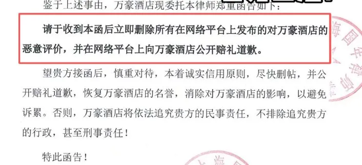 10月22日,该网友再度发布视频更新事件进展,称收到上海中优城市万豪酒店发送的律师函。酒店方提出,对于网友和其朋友在大众点评上的不实恶意评论,要求发布者限期删除。律师函中写到:请于收到本函后立即删除所有在网络平台上发布的对万豪酒店的恶意评价,并在网络平台上向万豪酒店公开赔礼道歉。