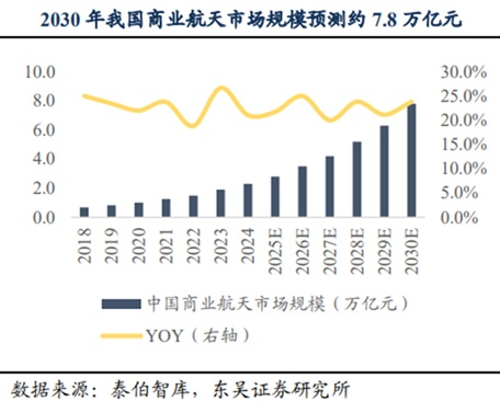 往后看,东吴证券的一份研报显示,预计到2030年,我国商业航天市场规模将达到7.8万亿元。对标美国SpaceX2016~2025十年间市值增长约40倍至4000亿美元,国内商业航天核心产业链环节亦有望孕育出百亿甚至千亿估值的本土龙头。