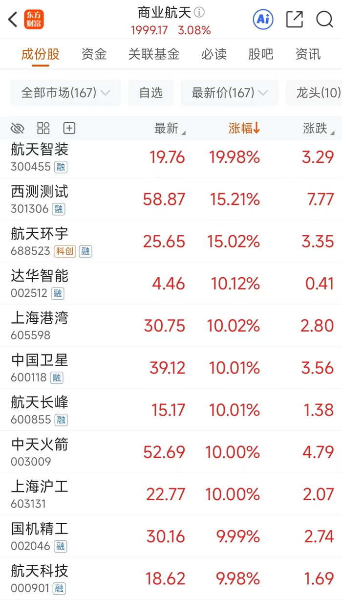 商业航天板块10月24日早盘表现强势,早盘收盘时板块中航天智装、中国卫星、国机精工、航天科技等9股涨停;西测测试、航天环宇大涨超10%。