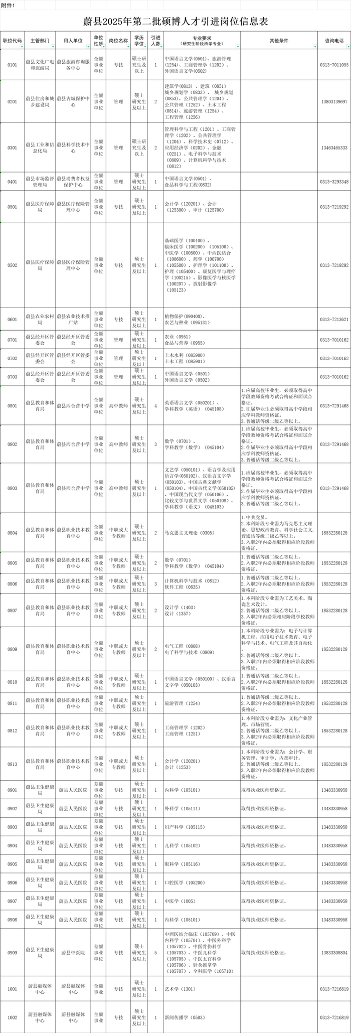 1.蔚县2025年第二批硕博人才引进岗位信息表