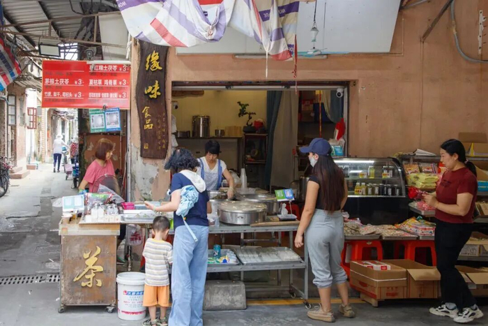 在博厦社区的巷子转角处,藏着一家街坊们口口相传的早餐店——香玉肠粉。这家开了33年的小店,是附近居民开启新一天的满满动力。店家总说:“我们也没有什么秘诀,时间就是我们的秘诀。”每天凌晨4点,他们就会到细村市场采买新鲜食材,再精心调味、制作,所有食材卖完即止,确保每一份都带着当日的新鲜。