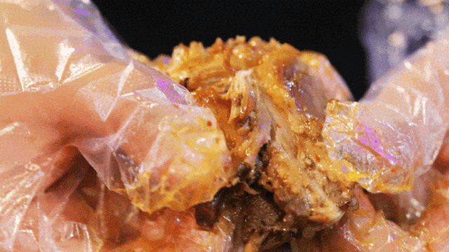 铁板炙烤下,鸡架滋滋冒油