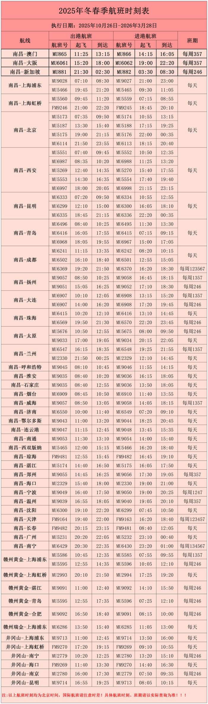 航班换季后部分航班时刻有所调整,
