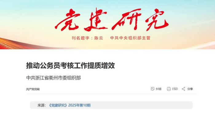 中组部主管的《党建研究》2025年第10期刊发中共浙江省衢州市委组织部关于推动公务员考核工作提质增效的文章。
