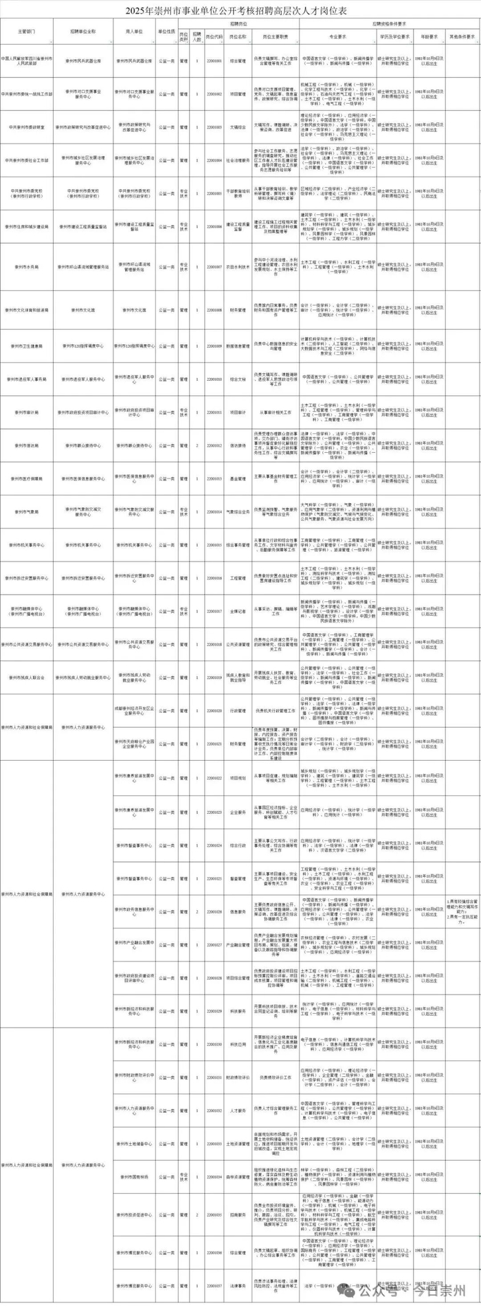 为加强崇州市人才队伍建设,根据《成都市事业单位公开招聘工作人员办法》(成人社规〔2025〕1号)规定及事业单位用人需求,结合《崇州市事业单位引进高层次人才办法(修订)》(崇委办〔2016〕30号)规定,按照“公开、平等、竞争、择优”的原则,现面向社会公开考核招聘事业单位工作人员40名。本次招聘为编制内招聘,招聘人员按事业单位人员聘用制管理。现将招聘工作的有关事项公告如下: