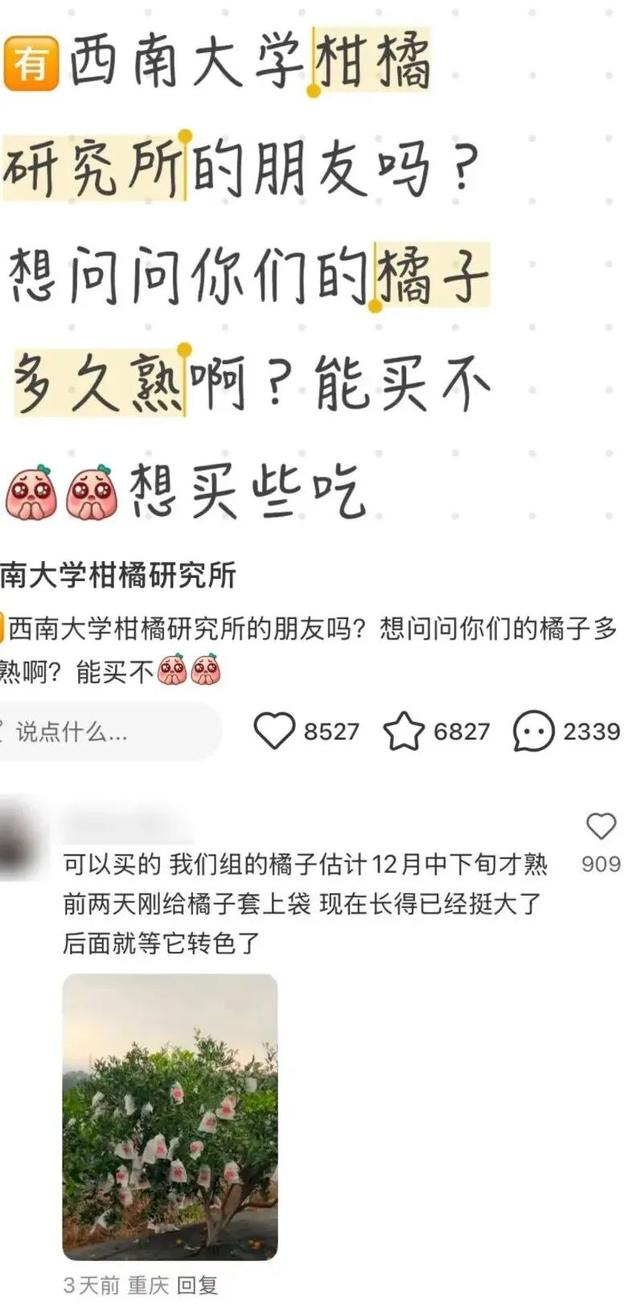 今年10月初,李顺心的“销售团队”继续在网上售卖柑桔。不同于往年的是,今年在社交平台上出现不少了求购的帖子“有西南大学柑桔研究所的朋友吗?想问问你的橘子多久熟啊?能买不?”评论区不仅有往年的“买家秀”,更有大量网友在线求购。