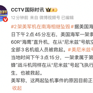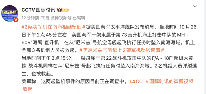 据@CCTV国际时讯 此前报道,美国海军太平洋舰队发布消息,当地时间10月26日下午2点45分左右,美国海军一架隶属于第73直升机海上打击中队的MH-60R“海鹰”直升机,在从“尼米兹”号航空母舰起飞执行任务时坠入南海海域。机上全部3名机组人员被救起。