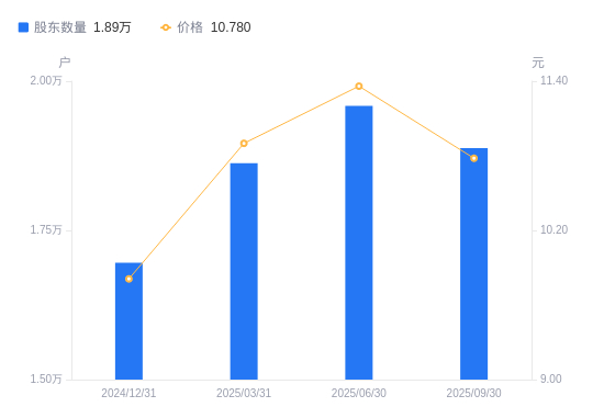 10月27日消息,数据显示,截至2025年9月30日,隆华新材A股股东总户数为1.89万户,较上期(2025年6月30日)减少706户,降幅3.60%。公司最新A股总股本为4.3亿股,其中流通A股2.61亿股,户均持有流通A股数量为1.38万股,较上期增加498.8股,增幅3.74%;户均持流通A股市值14.92万元,较上期减少2359.14元,降幅1.56%。