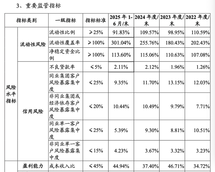 更为严峻的是,衡量银行风险抵御能力的拨备覆盖率出现了大幅下滑。该指标从2022年末的168.42%,下降至2023年末的116.18%,继而降至2024年末的105.47%,到2025年6月末为103.94%。这意味着,其拨备覆盖率已连续两年低于150%的监管要求。银行用于抵御风险的“安全垫”正在显著变薄。