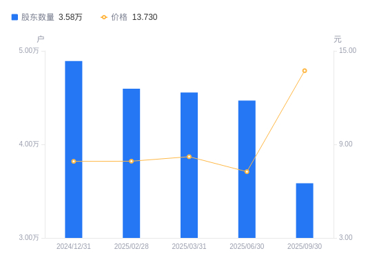 近一年(2024年9月30日至2025年9月30日),云意电气A股股东户数从4.25万户,减低至3.58万户,降幅15.71%,区间股价上涨117.83%。