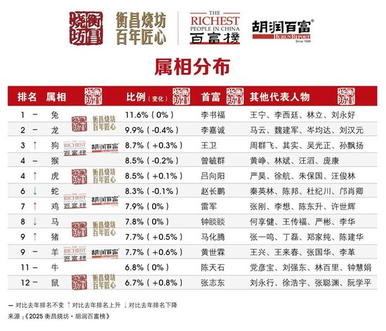 今年上榜人数占比中,鼠是增长最多的生肖,属鼠的企业家包括希音41岁的许仰天、公牛53岁的阮学平;龙则是下降最多的生肖。兔延续强势表现,已连续14年稳居上榜人数占比最高生肖,属兔的企业家包括吉利62岁的李书福、泡泡玛特38岁的王宁;龙保持第二名位置,属龙的企业家包括老铺黄金61岁的徐高明、蜜雪49岁的张红超;狗成功超越蛇升至第三名,属狗的企业家包括顺丰55岁的王卫、快手43岁的宿华;而去年位列第三的蛇,今年下降至第六名,属蛇的企业家包括牧原60岁的秦英林、币安48岁的赵长鹏。