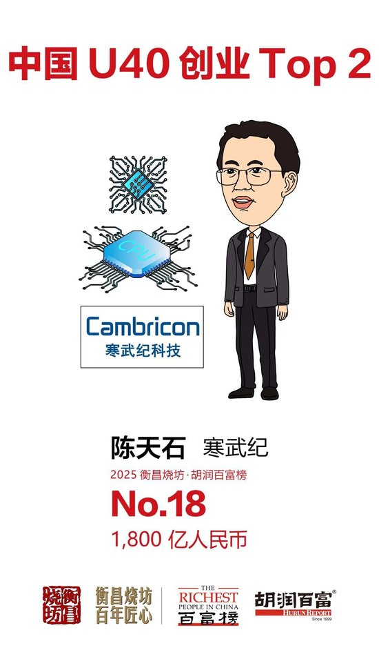 “AI热浪席卷全球,算力赛道,‘中国的英伟达’寒武纪40岁的陈天石财富比去年增长近1500亿元,进入榜单前20。他毕业于中科大少年班,31岁便踏上创业之路。表现出色的还有印制电路板制造企业胜宏科技的陈涛、刘春兰夫妇,增长近600亿元,进入前100;瑞芯微的励民增长300多亿元;综合算力中心头部企业润泽科技的周超男财富增长200多亿元。‘中国的ChatGPT’Kimi的创始人32岁杨植麟以73亿元财富首次上榜。”